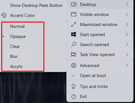 - Once the app is downloaded, open it. You’ll notice your taskbar will immediately become transparent. * The app will run in the system tray. To change its settings, right-click on it. This will give you access to its menu.