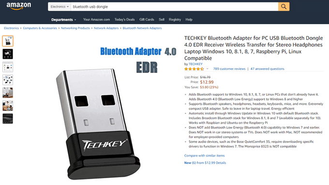 Bluetooth dongles are cheap, with prices coming in around $12 as of this writing on Amazon Prime. They work by plugging them directly in one of the available USB ports on your computer.