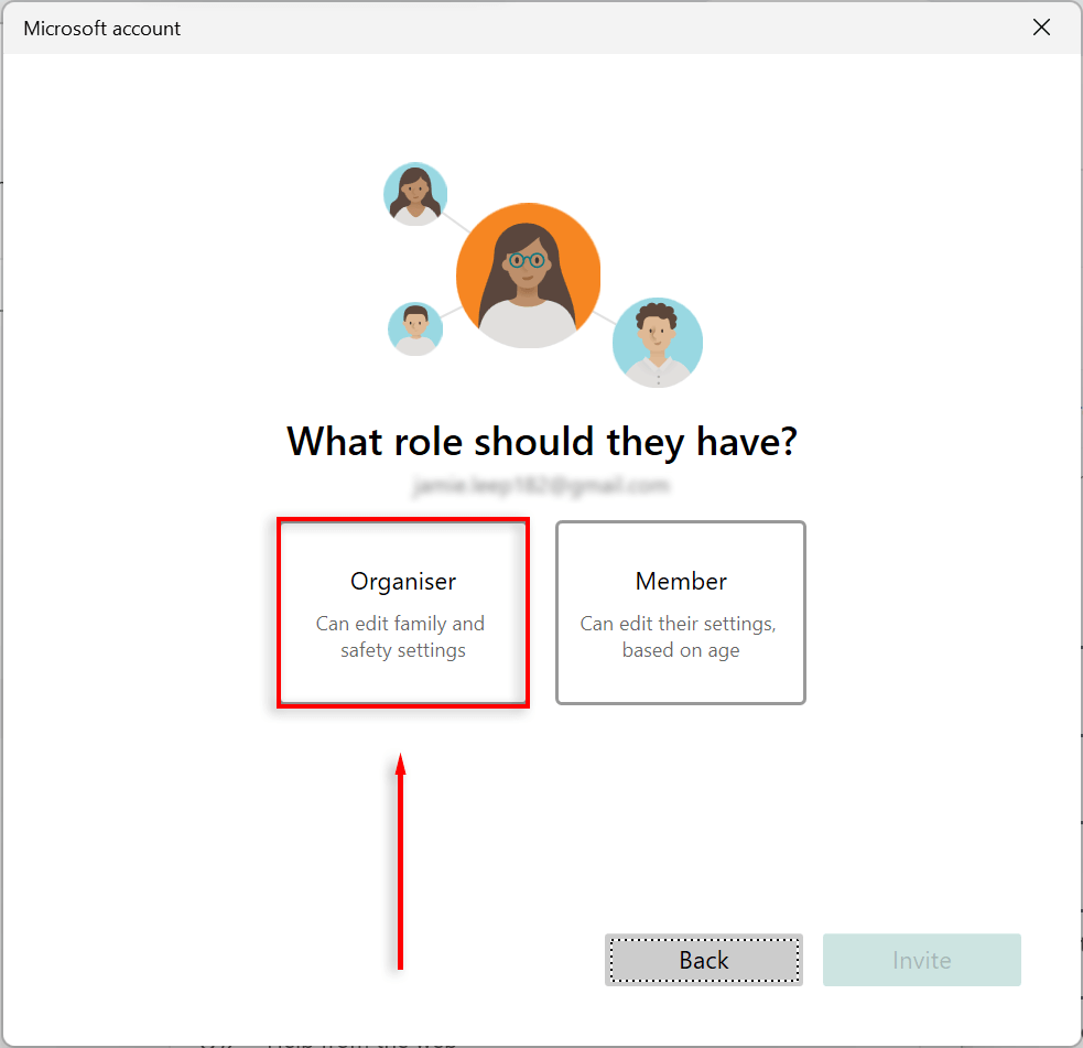 - Select the Member option to add a child account, and select Organizer to add an adult one. Then, Press the Invite button.