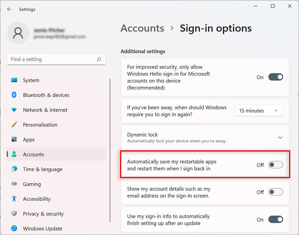 - Under Additional settings turn off the toggle next to Automatically save my restartable apps and restart when I sign back in.