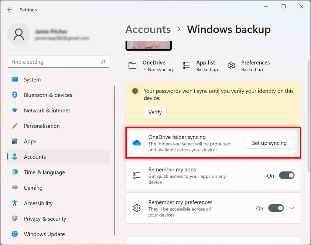You can determine how your account settings sync in Windows 11. This configures which folders are backed up in OneDrive. You can also decide whether the system will remember your apps and settings across devices with the same Microsoft account.