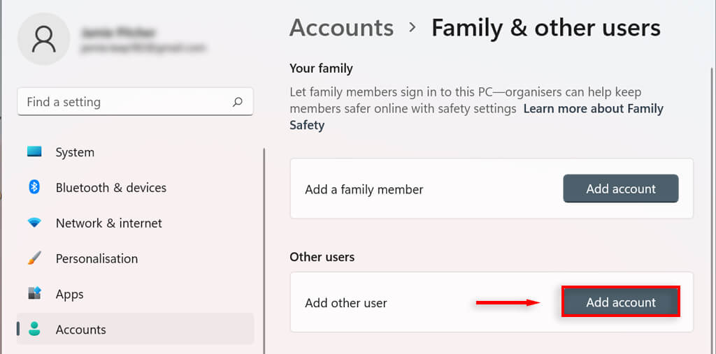 - Under the Other users section, select Add account.