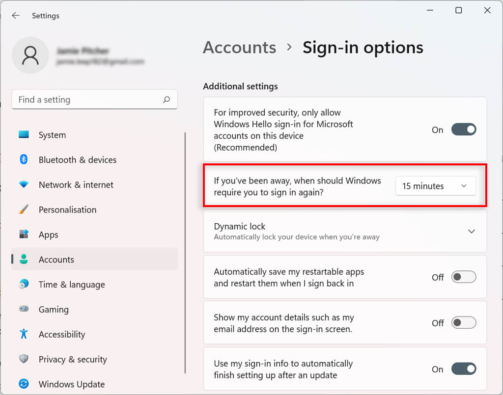 - Under Additional settings, select the drop-down box next to If you’ve been away, when should Windows require you to sign in again?