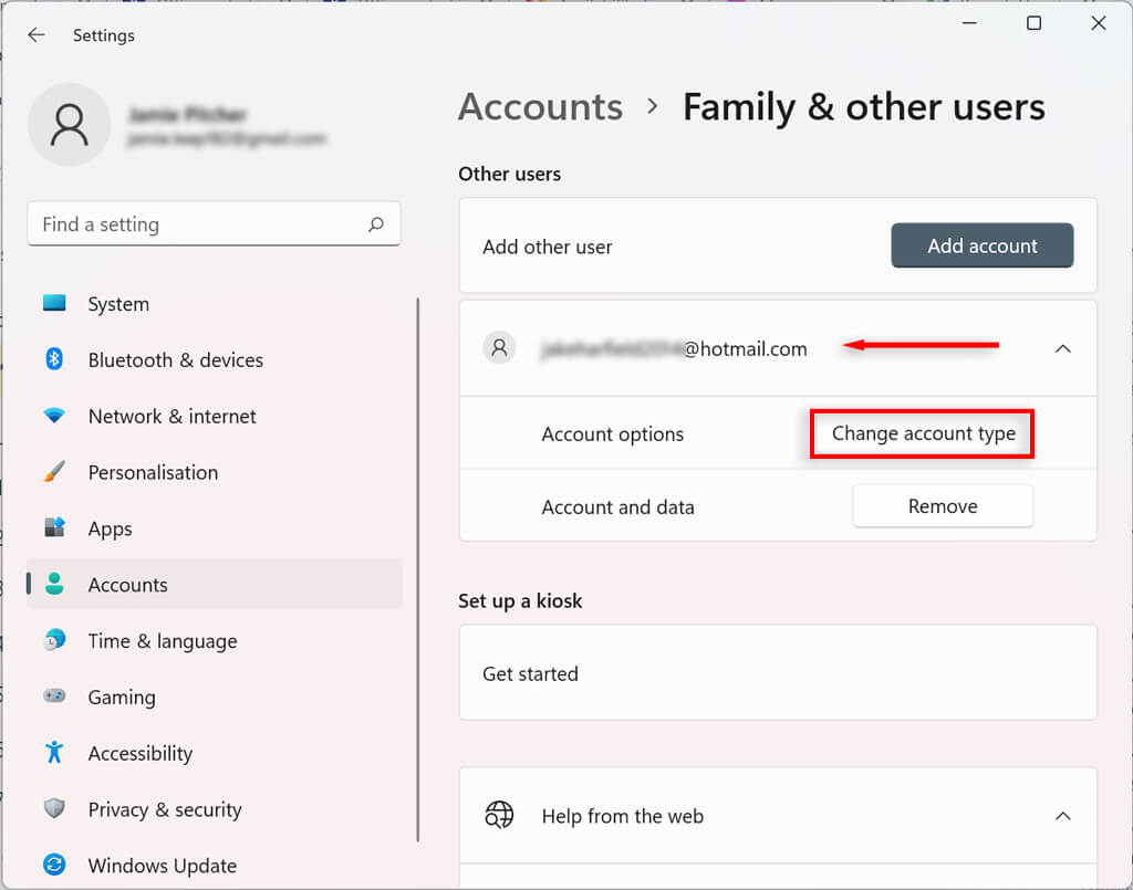 - Under Other users, select the account you would like to change and select Change account type.