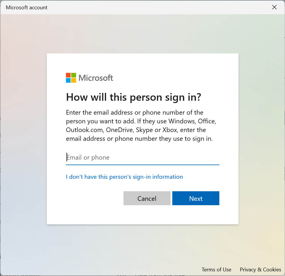 - Enter the email address or phone number of the new user and select Next.