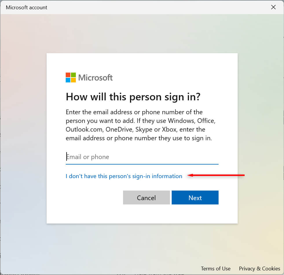 - In the new dialog box, choose I don’t have this person’s sign-in information.