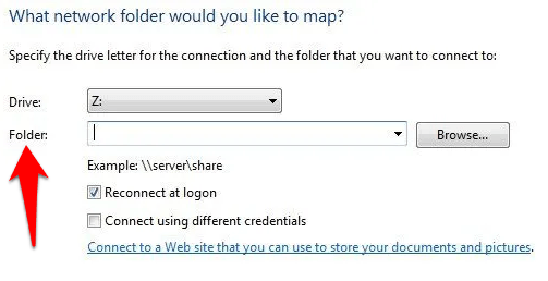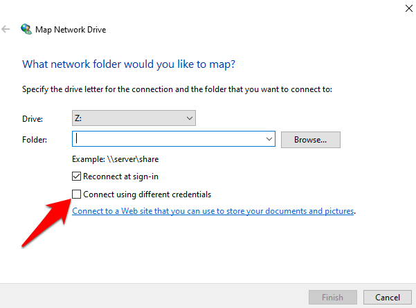 - If you need to access the shared network folder using credentials for a different account, tick Connect using different credentials.