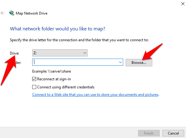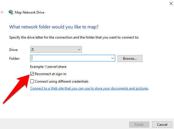 - Select Reconnect at sign-in to connect each time you log into your computer. It ensures the mapped drive is available to you every time, but if you don’t want this, uncheck the box.