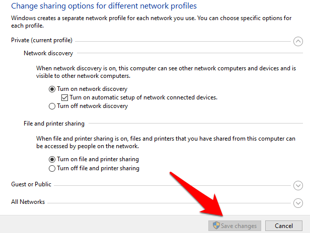 - Click Save changes. If the Save Changes button is grayed out, it means Network Discovery is already enabled, so you can ignore this step.