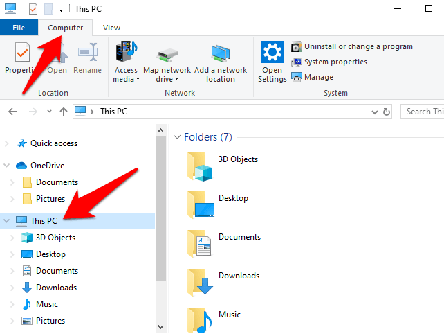 - Click This PC and go to the Computer tab. Alternatively, search for This PC with Cortana.