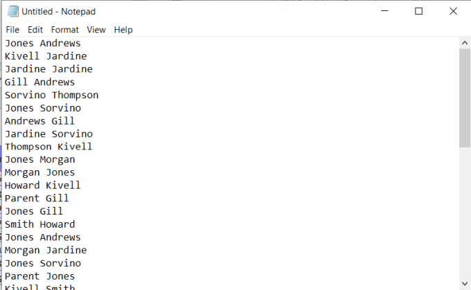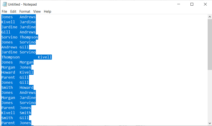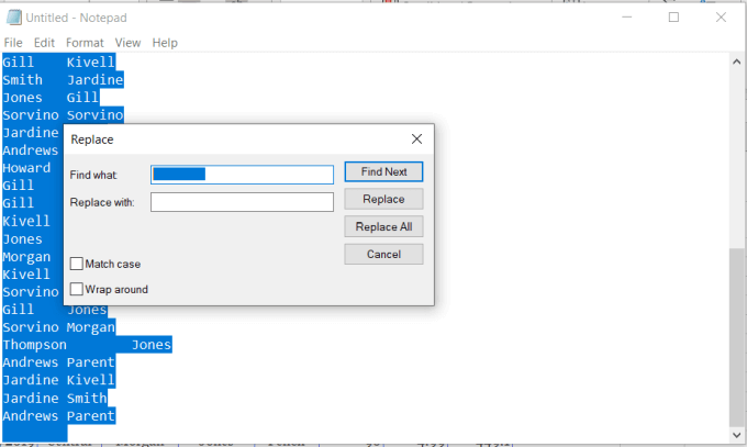 - Now select **Replace All**, and all of the text in the Notepad document should appear normal, with the first name and last name separated by just a single space.