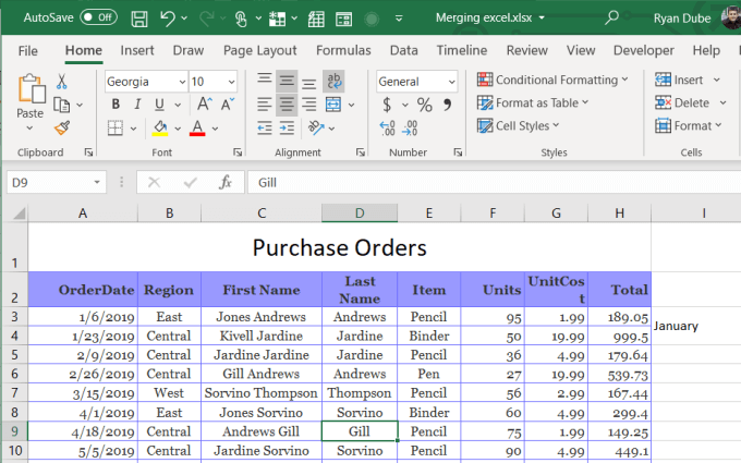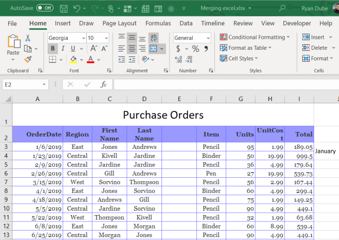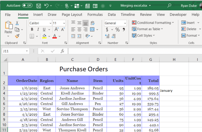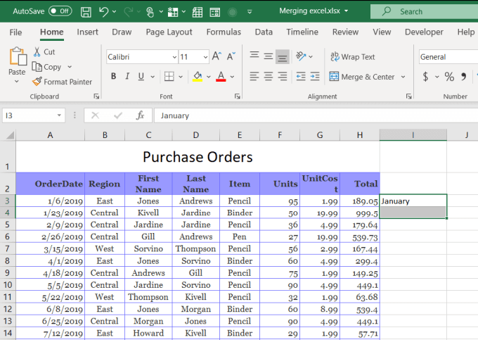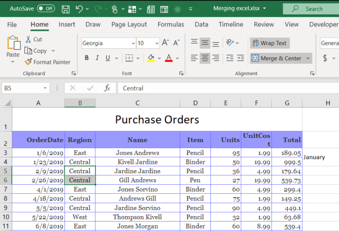 Of course the Merge & Center does work for multiple rows that hold the same data. For example in this spreadsheet, both February entries are from the “Central” region. Instead of repeating this twice, you could merge these two rows into one.