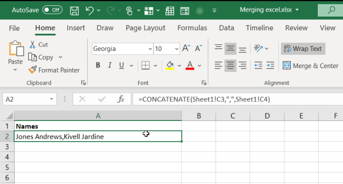 This function combines text from multiple cells into one. You could even use it to merge as many columns as you want, not just two.