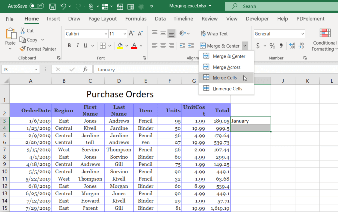 - Now, with those cells selected, in the **Home** menu select the dropdown arrow next to **Merge & Center**. Select **Merge Cells** from the dropdown menu.