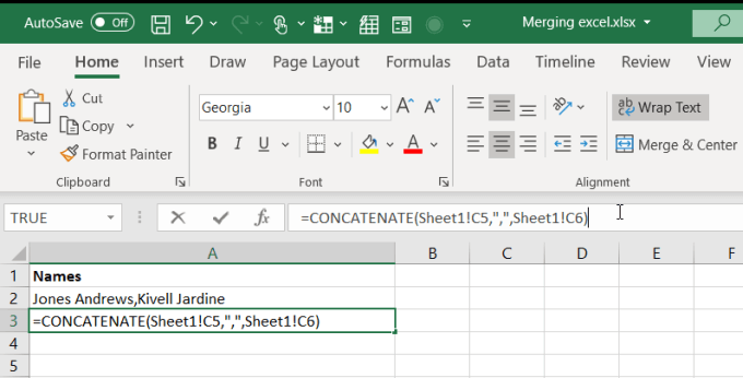 - When you press Enter, you’ll see the concatenated data appear in the new row, separated by commas. To merge more rows, just copy and paste the first cell into the second new row, and edit the formula to include the rows from the original sheet that you want to merge.