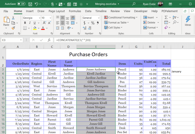 This is an automated fill feature in Excel. It’ll fill the formula to the bottom of that column as far as there’s data in the column to the left. Now you can see the entire column has data from the first two columns merged together.