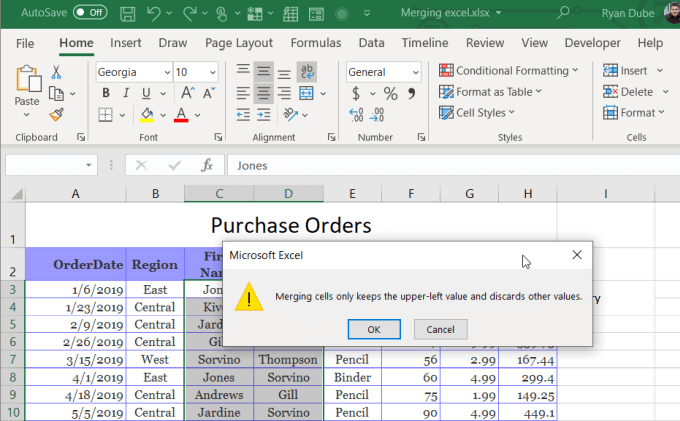 In this spreadsheet, if you select all of the data in the two columns and try to merge the cells using Merge & Center, you’ll see an error message that you’ll lose the data in all of the cells except the first cell in the range.