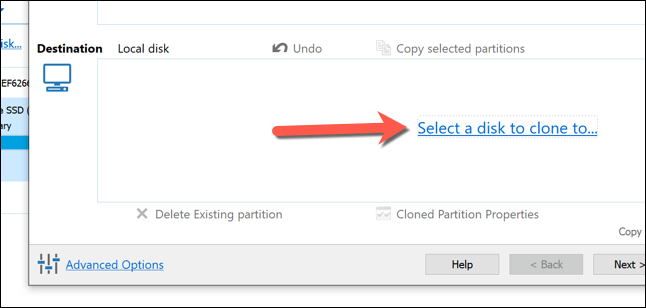 - In the **Clone **menu, select your new (smaller) drive by selecting the **Select a disk to clone to** option in the **Destination** section.