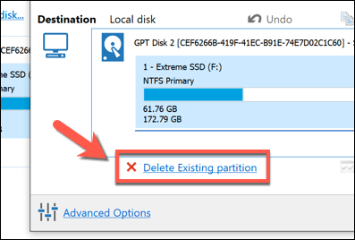 - With the new disk selected, you’ll need to delete any existing partitions on the drive by first selecting them in the **Destination** category, then selecting the **Delete Existing partition** option to remove them.