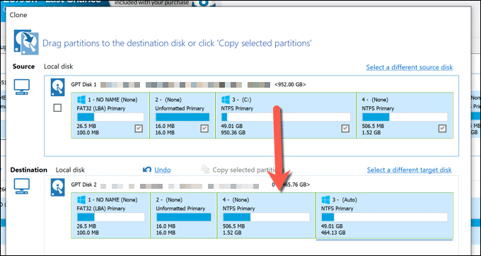 - With any existing partitions on your new drive removed, drag and drop each of the partitions on your drive (excluding the system C: partition) from the **Source** category to the **Destination** category. Leaving your system partition (C:) last, drag and drop that partition onto the **Destination** category.