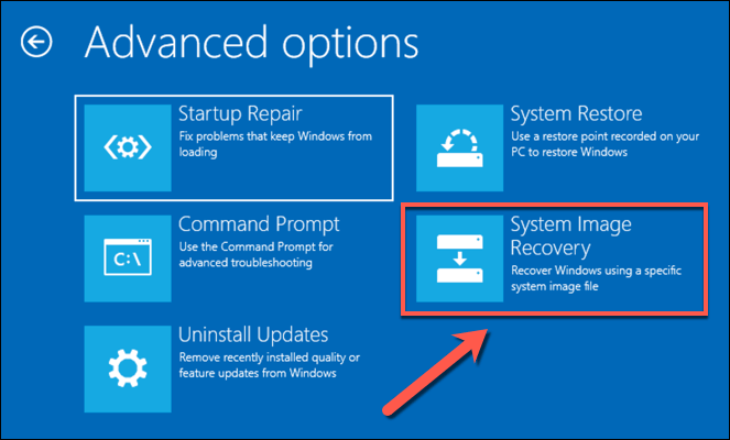 - In the **Advanced Options** menu, select **Troubleshoot **> **System Image Recovery**.