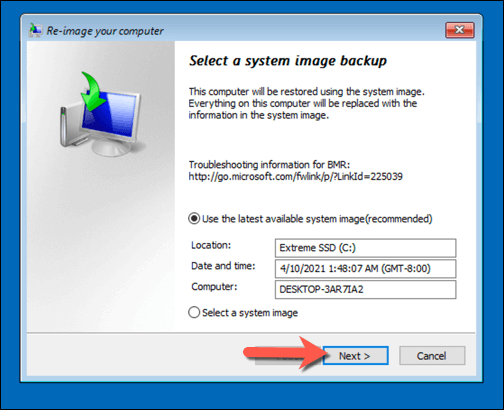 - Windows should automatically detect the system image on your external hard drive in the **Re-image your computer **menu. If it doesn’t, select the **Select a system image **option to locate it manually. Otherwise, leave the **Use the latest available system image (recommended)** option selected, then select **Next **to continue.
