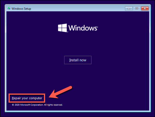 - To begin, insert your Windows installation media using a portable USB memory stick or DVD. Once inserted, boot your PC and ensure that your BIOS or UEFI settings prioritize that drive over any other drives. Once the Windows installation menu appears, select Next, then select Repair your computer in the bottom left corner.