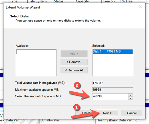 - In the **Extend Volume Wizard** menu, select **Next**, then ensure that the amount of additional space (equivalent to the figure in the **Maximum available space in MB **box) is selected in the **Select the amount of space in MB** box. Select **Next** to continue.