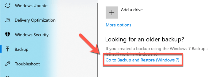 - In the **Settings** menu, select **Update & Security **> **Backup. **In the **Backup **menu, select the **Go to Backup and Restore (Windows 7) **option, listed under the **Looking for an older backup? **category.