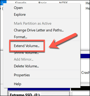 - In the **Disk Management** menu, right-click your system partition (C:) and select **Extend Volume**.