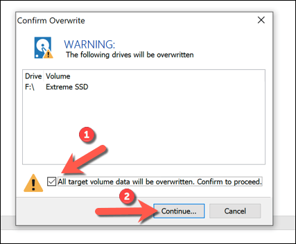 - Macrium will need permission to delete existing partitions and begin the cloning process. Select the available checkbox in the **Confirm Overwrite** menu, then select **Continue** to proceed. Allow some time for the cloning process to finish.