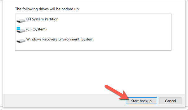 - Windows will confirm the partitions on your drive that will be copied to the new system image. Select **Start backup** to begin.