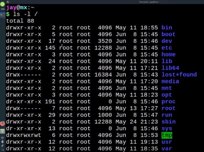 But you can also add additional commands to ls. For example, typing ls -l**/** displays a different output than** just /**. Try it by using the following command: