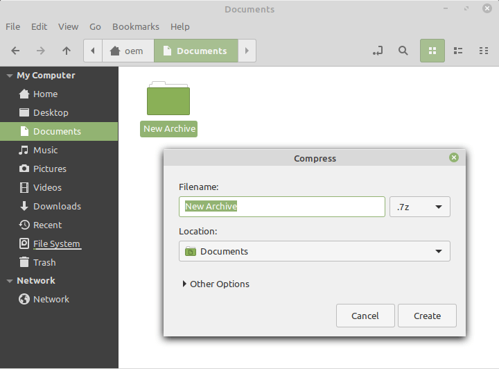 You can also compress items in the 7z format. Highlight and select the item or items you want to archive, then right-click and select Compress. Set 7z as the compression format and select Create.