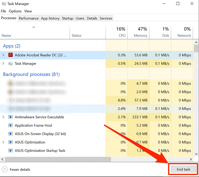 - Click on the Processes tab at the top if you aren’t already there. You should see all the processes that are currently running on your computer. You want to find the process that you think is using your file. Then click on the process to select it and then click on the End task button at the bottom-right corner.