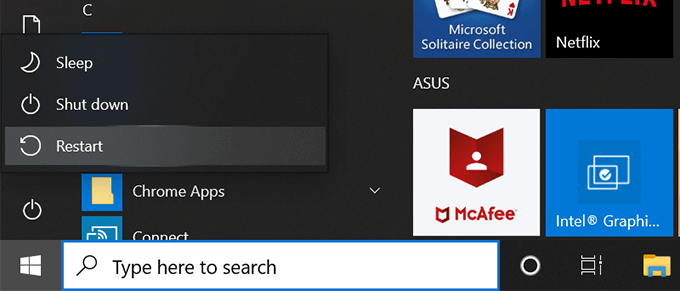 - Click on the Start Menu, select the power icon, and choose Restart.