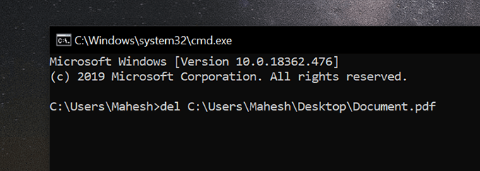 - Type in the following command and press Enter. Make sure to replace PATH with the path of the file you want to delete. del PATH