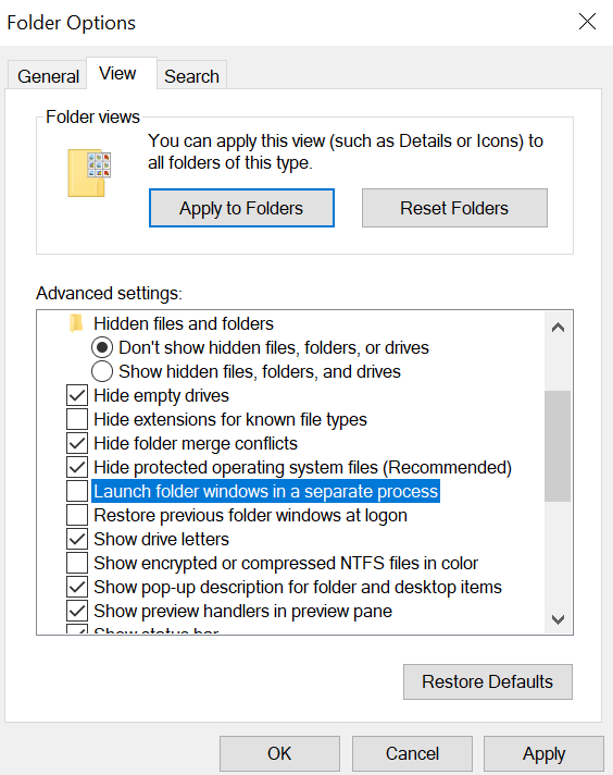 - You’ll find several options that you can enable and disable for the File Explorer utility. Find the option that reads Launch folder windows in a separate process and enable it. If the option is already enabled, you should disable it.