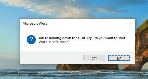 - You’ll get the following message prompt: **You’re holding down the Ctrl key. Do you want to start Word in Safe Mode?** If using Excel, it’ll be the same message.