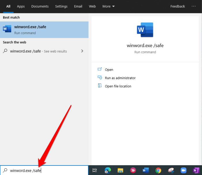 - Type winword.exe /safe or excel.exe /safe in the Windows search box or Cortana.