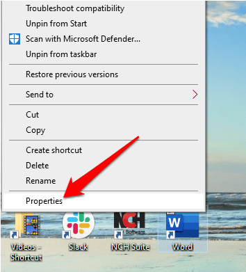- Next, right-click the shortcut you’ve just created on the desktop and select **Properties**. You can also highlight the icon and press **Alt** + **Enter** to open the **Properties** window.