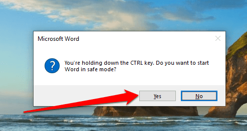 - Release the **Ctrl** key and select **Yes** to open Word in safe mode.