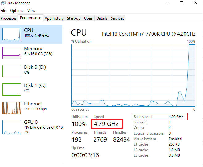 As you can see above, my speed shows 4.79GHz once under full load, despite my ‘Base speed’ still showing 4.2GHz.