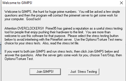 Next, **open Prime95. **When opening for the first time, **click ‘just stress testing’ **on the prompt that appears.