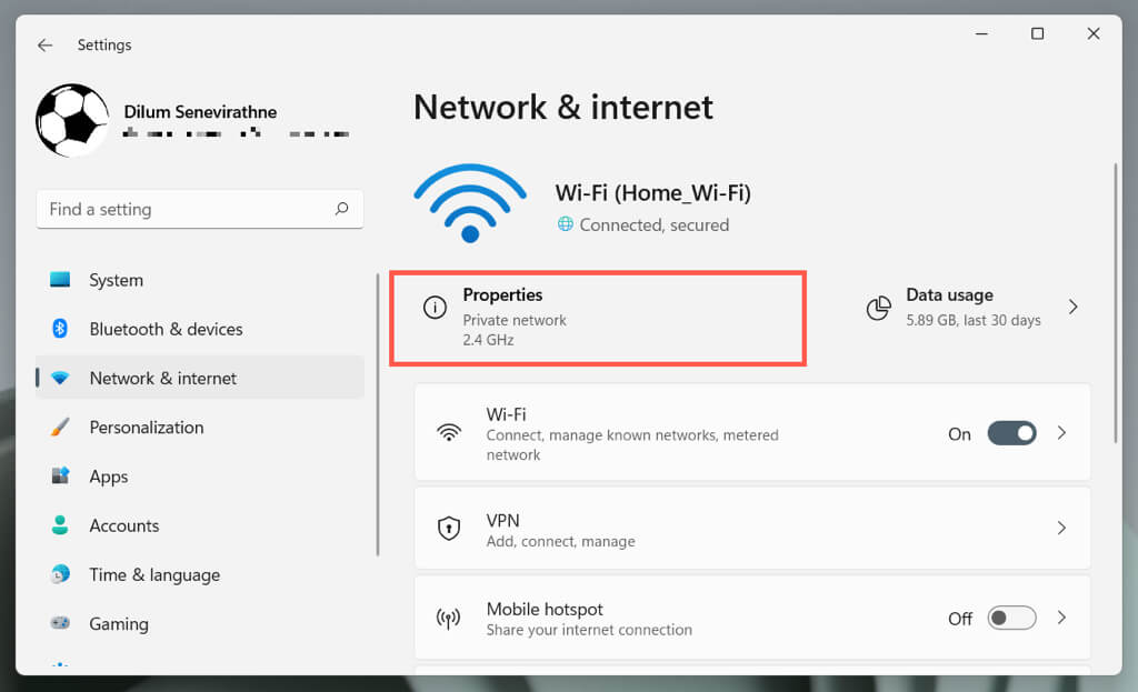 - Select Properties under the network name.
