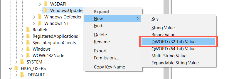 - Right-click the WindowsUpdate folder and select New > DWORD (32-bit) Value.