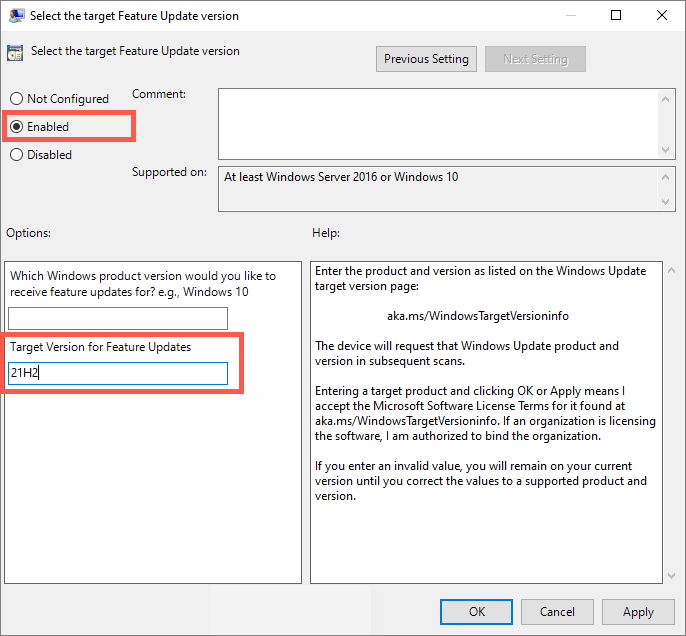 - Select the radio button next to Enabled. * Type the current Windows 10 version into the Target Version for Feature Updates field.