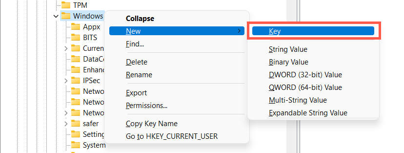 - Right-click the Windows folder on the left pane and select New > Key.
