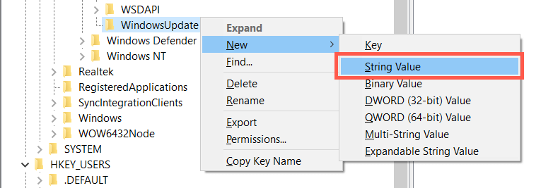 - Right-click the WindowsUpdate folder again and select New > String Value.