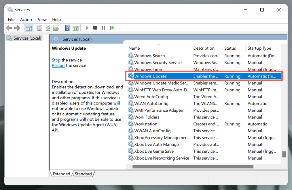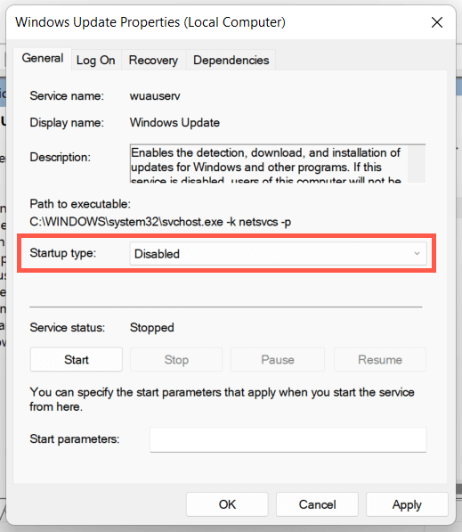 Another way to block new updates is to stop the Windows Update service from running in the Windows 11 background.